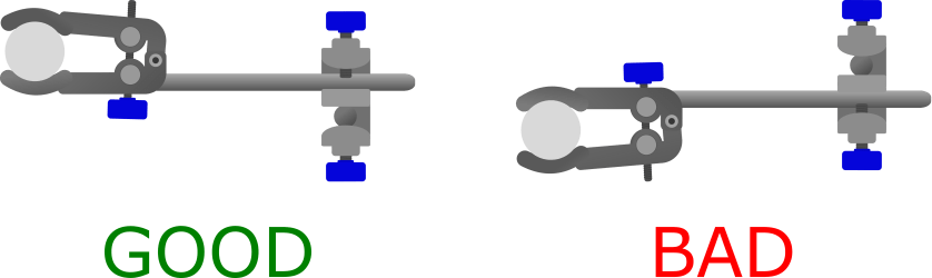 Schlenk lines are supported by lattice lab frames that are secured to the back wall of the fumehood. It is recommended to secure the Schlenk line at a comfortable height with at least three clamps, securing both the vacuum and inert gas manifold to prevent slippage or tilting. Orient the clamp so that the weight of the Schlenk line is supported by the bottom (the non-moving arm) of the clamp – this means that the thumbscrew is always at the bottom or underneath the glassware being supported. This same principle should also be applied to boss heads.