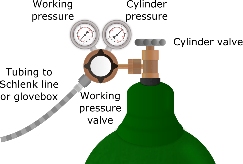 Gas regulators allow the gas pressure to be monitored and adjusted. During usual working operation, the gas regulator should not need to be adjusted. The cylinder valve allows the gas to enter the regulator, which typically has two gauges. The cylinder pressure gauge indicates how much gas is left in the cylinder and will therefore show when it needs to be replaced. The working pressure gauge shows the outlet delivery pressure of the gas, which is adjusted using the working pressure valve. If the gas cylinder is supplying inert gas to a single glovebox or Schlenk line, an additional outlet pressure valve may be placed before the tubing, and during day-to-day operation this is the only valve that should need to be adjusted. It is important to note that gas regulators have a limited lifespan and must therefore be assessed by a trained professional prior to use to ensure they are operating safely within the manufacturers recommendations.